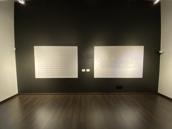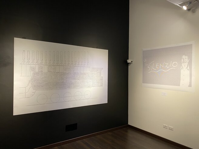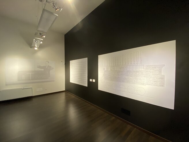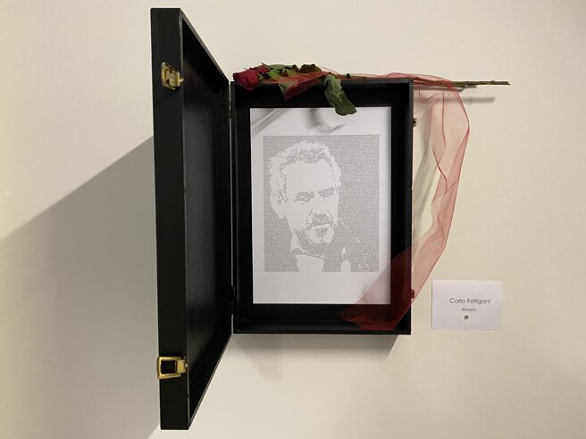 Carlo FATIGONI presenta un omaggio ai pionieri del suono, dell’arte sonora. Per le opere da muro grandi micrografie, libri, trascrizioni scritturali che generano un immagine monocroma. Le lettere hanno carattere e indicano un suono. Tante lettere sono una sinfonia.